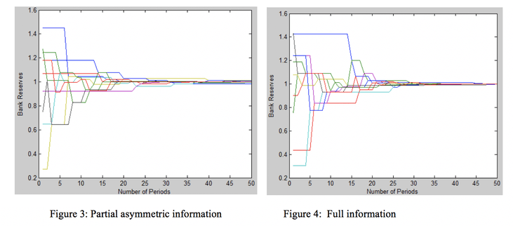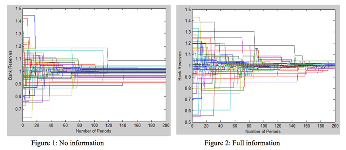 Figure 2 shows that with full information banks are able to get much closer to convergence because lending banks can avoid having their loans defaulted on and avoid the subsequent health penalty to the lender. Both figures use the same parameters except for information and it should be noted that some of the difference in behaviour in the early periods is a result of the stochastic matching and shock processes. Also, this result was tested for its sensitivity to changes in other parameters and it was a very general result.