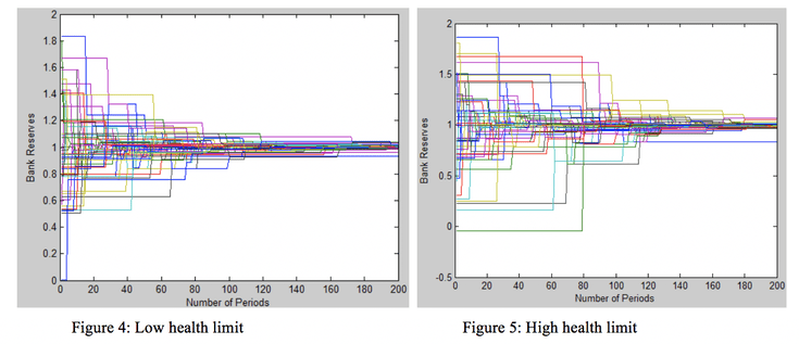 This experiment shows the differences in bank reserve convergence under two different health limits. Remembering from the computational model section, the health limit of the market is used when lending banks decide whether or not to make a loan. If the health limit is high more banks will be eligible to receive loans given that banks are operating under full information.